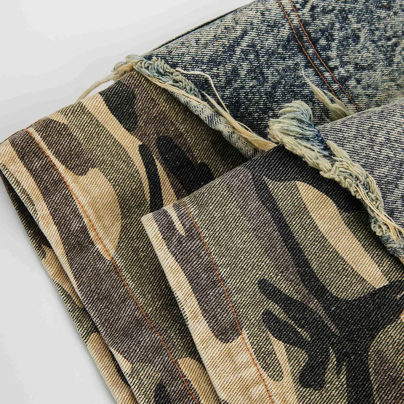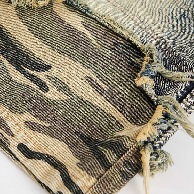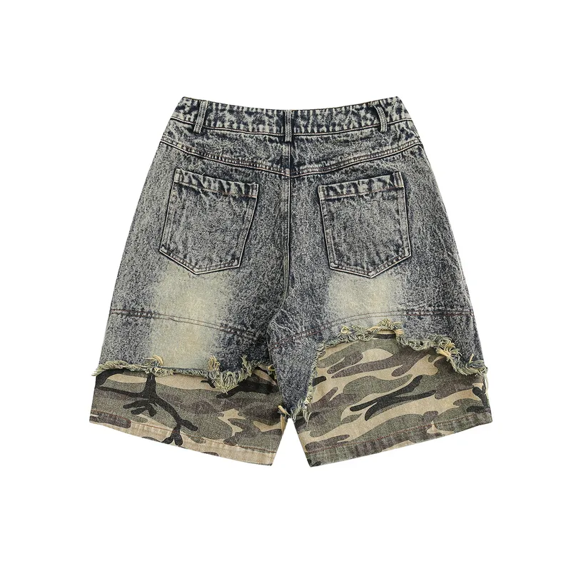 Jiayiku Men's American Vintage Camouflage Washed Damaged Denim Pants Fake Two-piece Vibe Shorts Men's