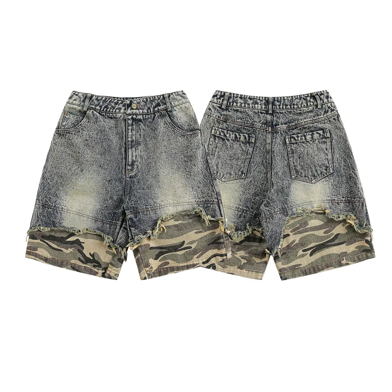 Wholesale Jiayiku Men's American Vintage Camouflage Washed Damaged Denim Pants Fake Two-piece Vibe Shorts Men's