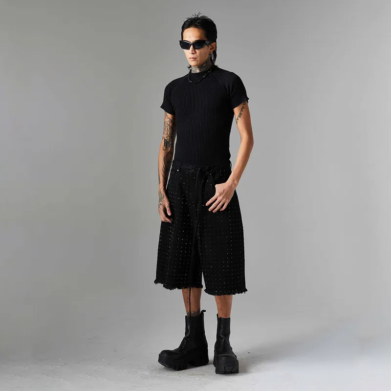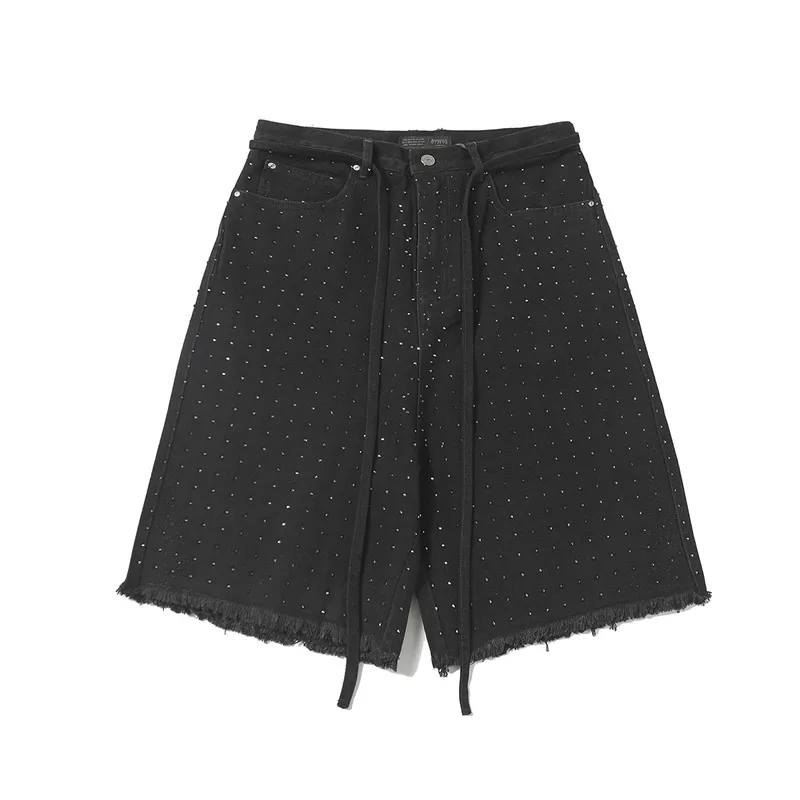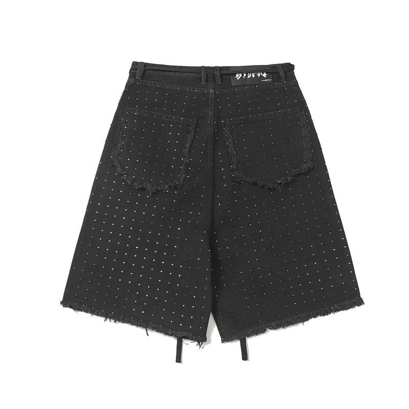 Jiayiku Men's High Street American Style Vintage Washed Burr Edge Denim Shorts Heavy-duty Hot-drill Distinctive Pants
