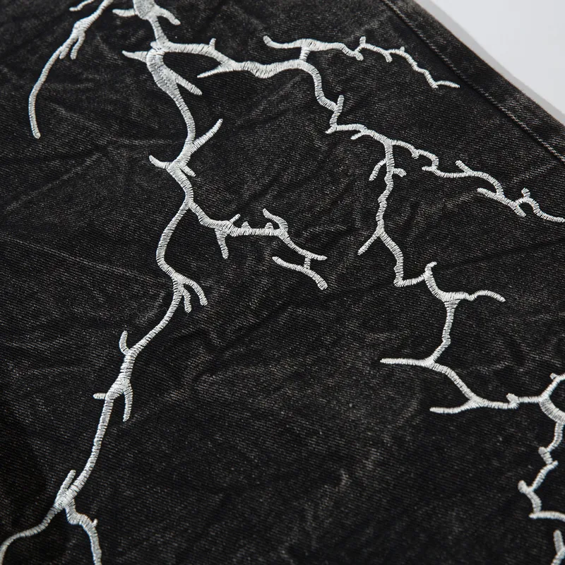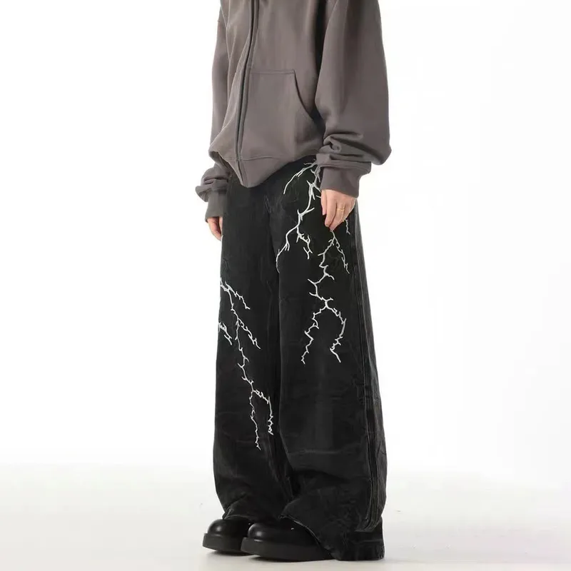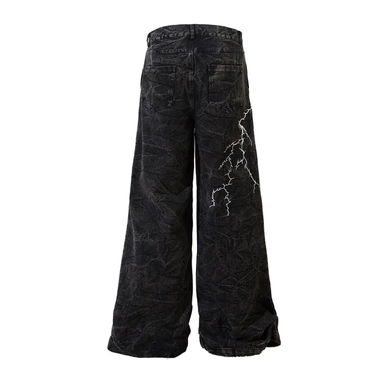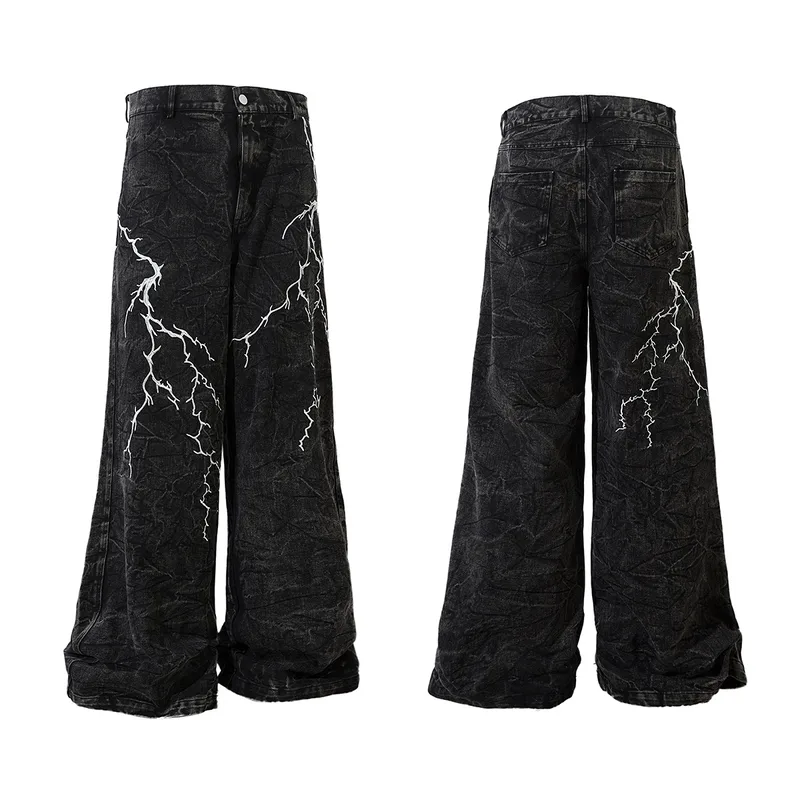 Jiayiku Men's High Street American Washed Micro-Lazy Jeans Men's Lightning Embroidered Design Wide Leg Pants