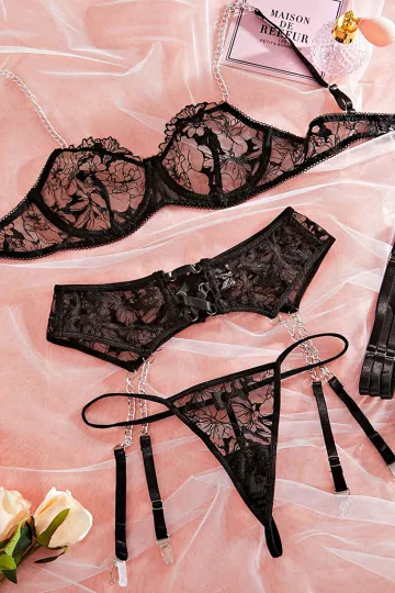 Mesh embroidered hanging chain suspenders hollow cross sexy lingerie set of four