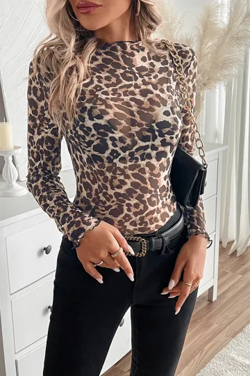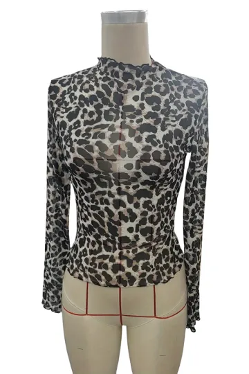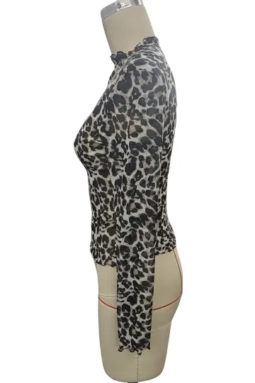 Wholesale Women's Sexy Leopard Print Mesh Ruffle Bodysuit T-shirt Top