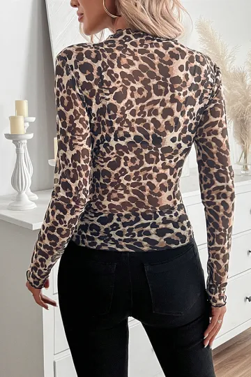 Women's Sexy Leopard Print Mesh Ruffle Bodysuit T-shirt Top