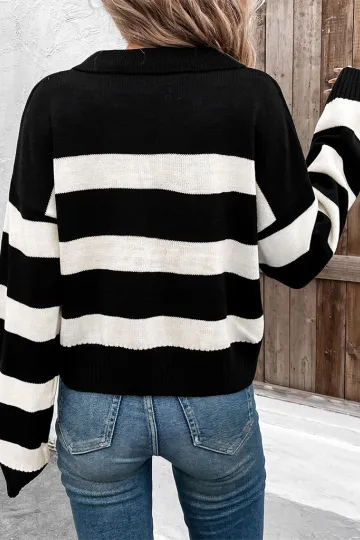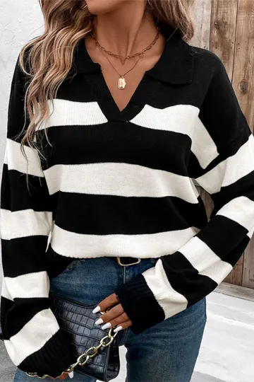 Wholesale New women's loose tops black and white striped lapel sweaters