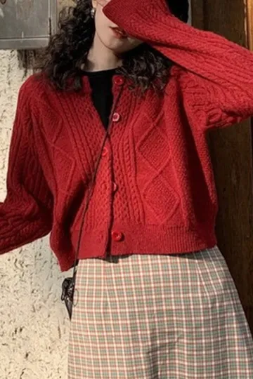 New retro gentle solid color round neck twist knitted cardigan loose short sweater jacket