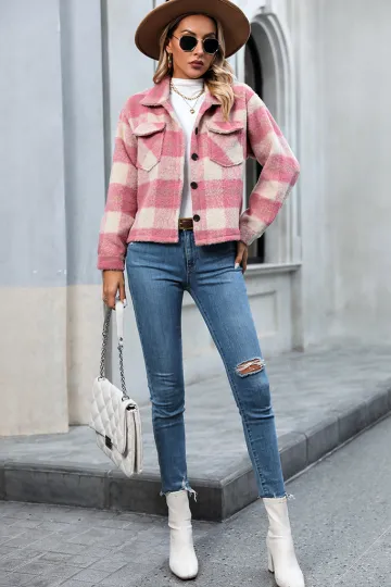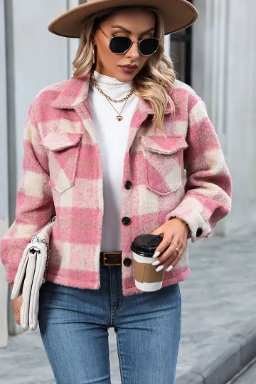 Wholesale Women's Short Mohair Plaid Button Jacket