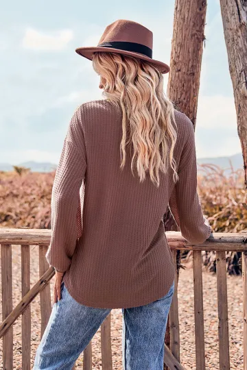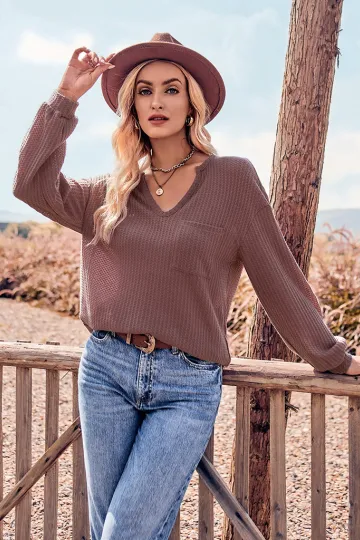 V Neck Casual Slim Long Sleeve Top with Pockets