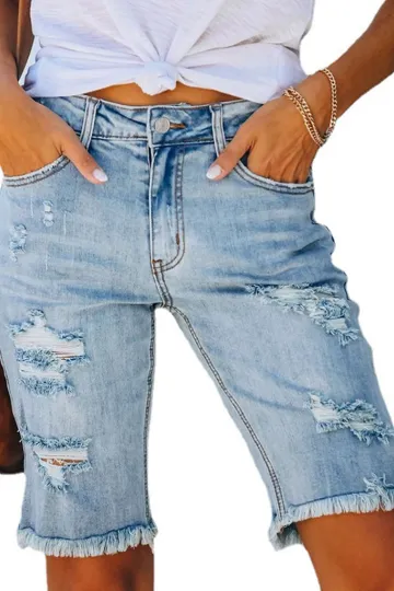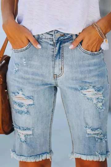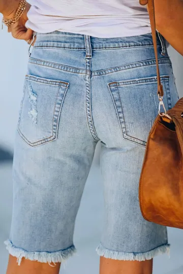 Street fringe high elastic pencil pants mid-rise cropped pants ripped jeans