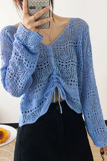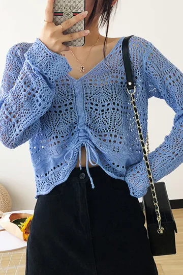 Wholesale Long-sleeved mesh summer top drawstring hollow V-neck blouse thin section