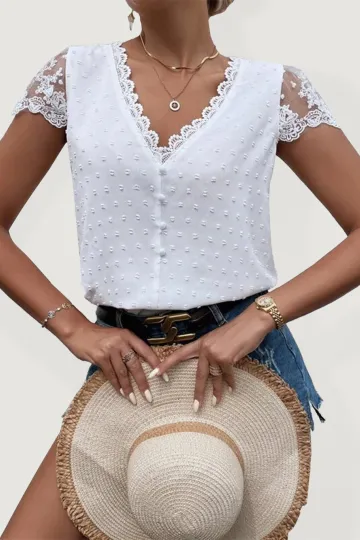 V-Neck Shirt Collar Sleeve Panel Lace Trim Shirt
