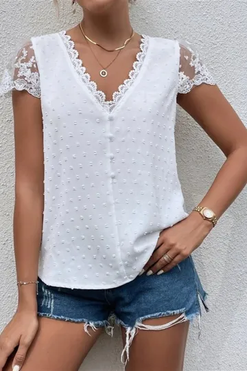 Wholesale V-Neck Shirt Collar Sleeve Panel Lace Trim Shirt
