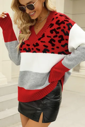 v-neck sweater women's cross-borde leopard print color matching knitted sweater women