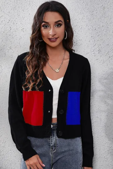 Wholesale Women's contrast stitched long sleeve knitted cardigan sweater