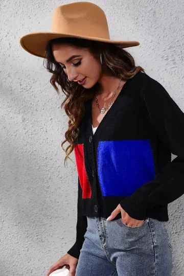 Women's contrast stitched long sleeve knitted cardigan sweater