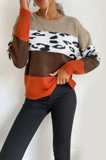 Top Leopard Print Colorblock Long Sleeve Sweater