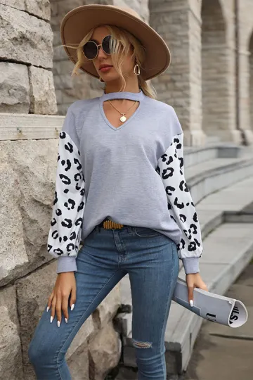 Wholesale European and American Contrast Knit Sweater Grey Long Sleeve Hollow Sweater