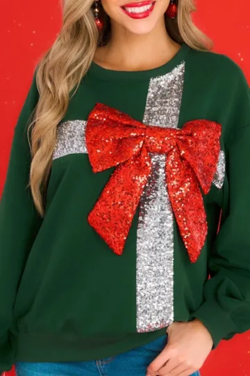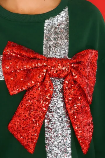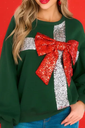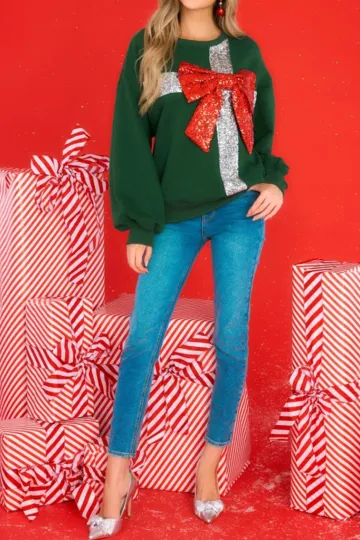 New autumn and winter bow fashion round neck long sleeve sequin splicing Christmas sweatshirt