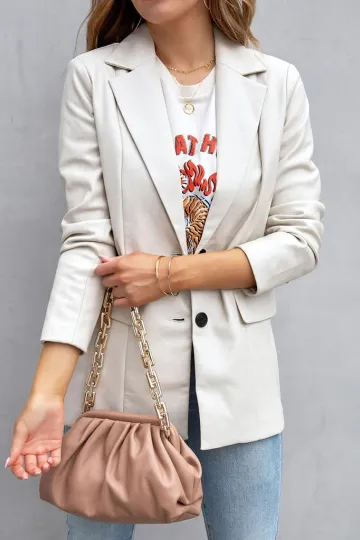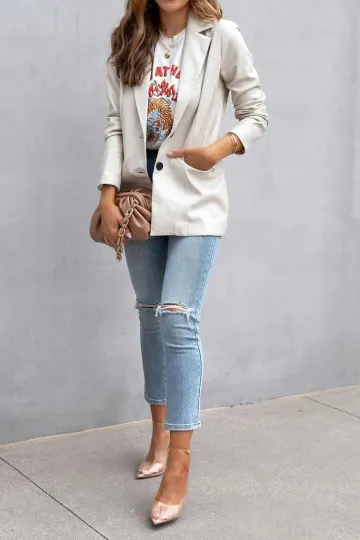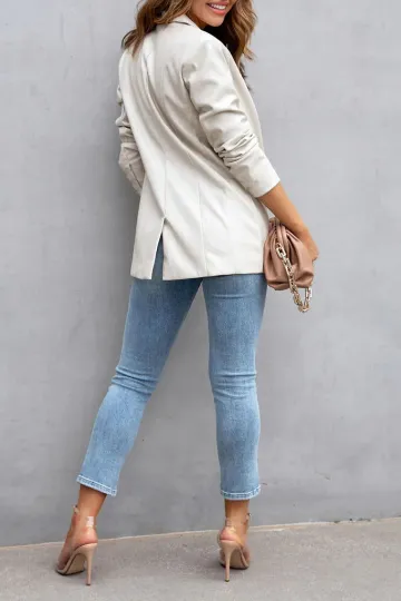 Long Sleeve Button Pu Cardigan Jacket Solid Color Pocket Casual Leather Small Blazer Women's Clothes