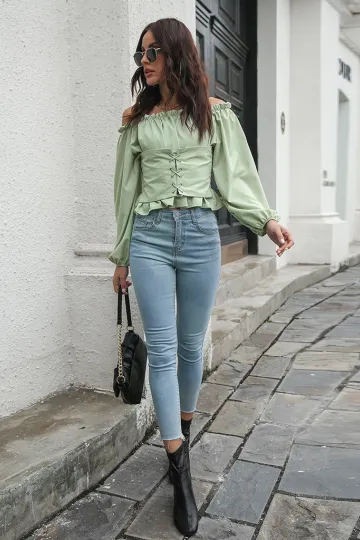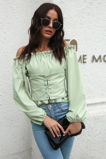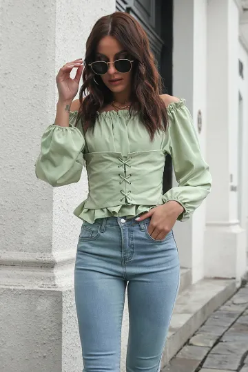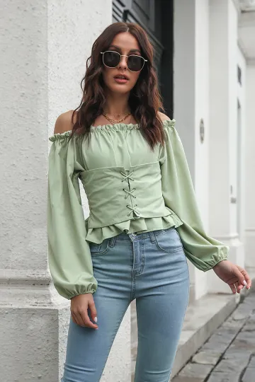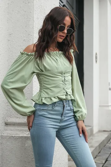 Wholesale Women's lace up Lantern Sleeve straight neck waist tunic jacket