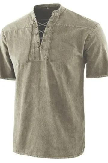 Men's Woven Retro Lace Up Collar Casual Short Sleeve Shirt