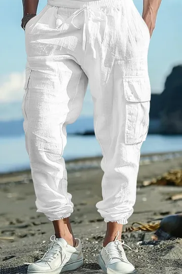Casual cuffs, multi-pocket drawstrings, solid color, loose large size drawstring trousers