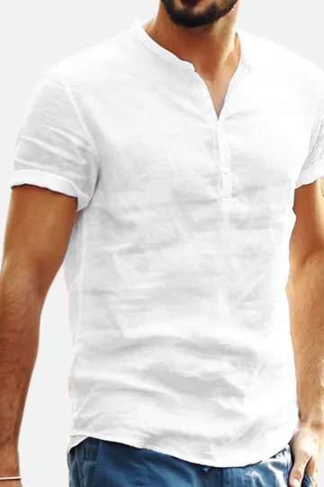 Men's Stand Collar Short Sleeve V Neck Cotton Linen Shirt