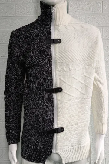 Men's high -necked color skin buckle long -sleeved knit sweater cardigan