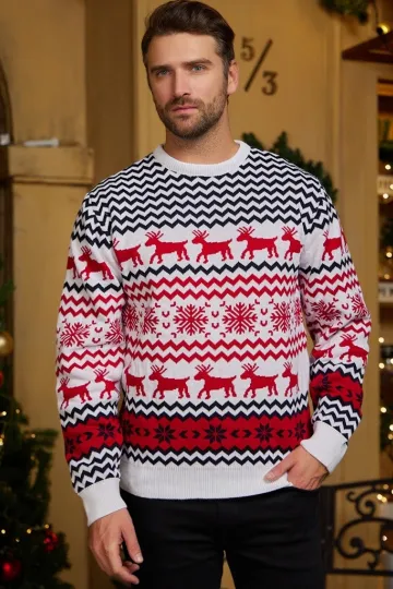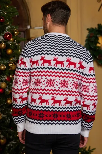 Men's Christmas Crew Neck Elk Jacquard Long Sleeve Sweater
