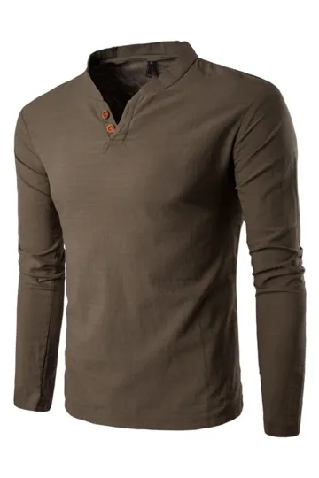 Men's Woven Cotton Linen Stand Collar Long Sleeve T-Shirt