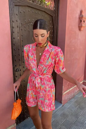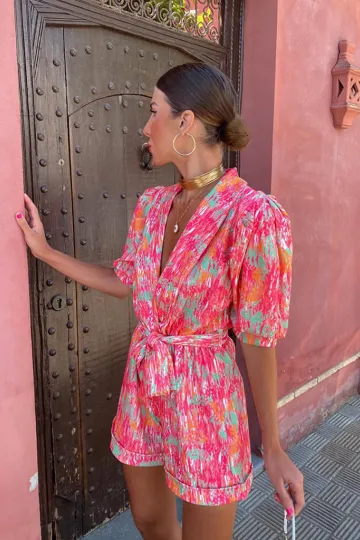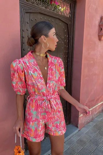 Wholesale New style deep V-neck bubble short-sleeved printed elastic waist jumpsuit