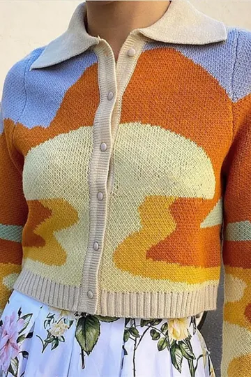 Lapel Embroidered Button Cropped Cardigan Colorblock Sweater