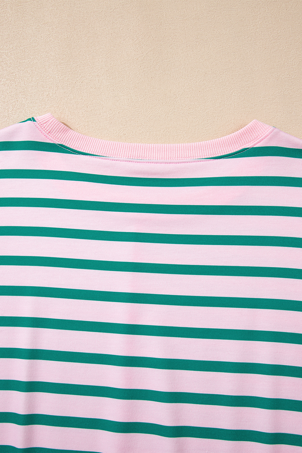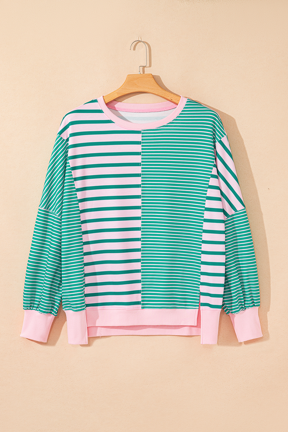Green Stripe Mix Pattern Color Block Patchwork Side Slit Baggy Sweatshirt
