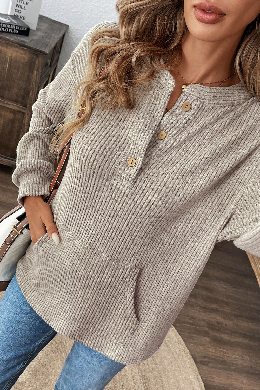 Simply Taupe Ribbed Texture Drop Shoulder Henley Knit Top