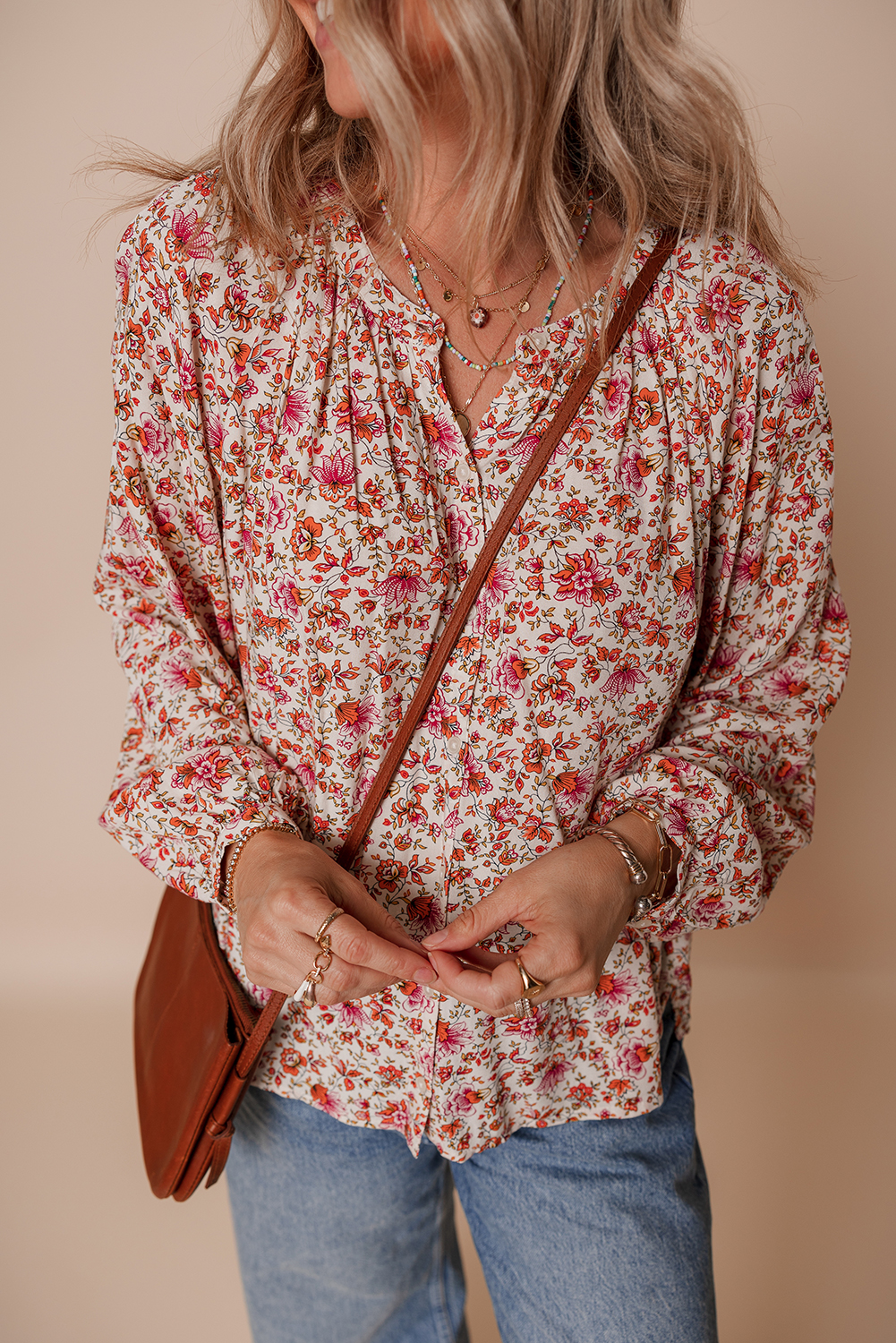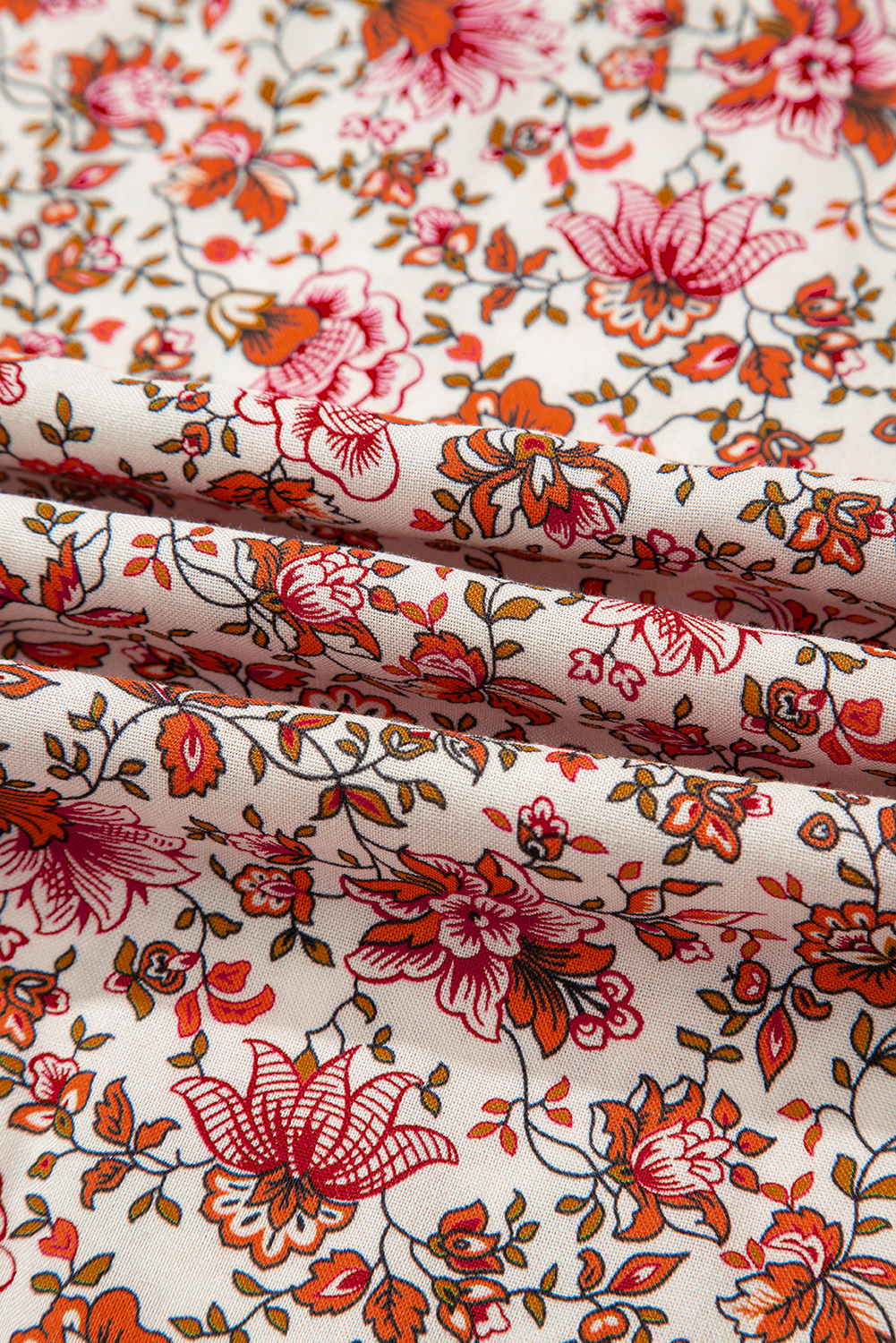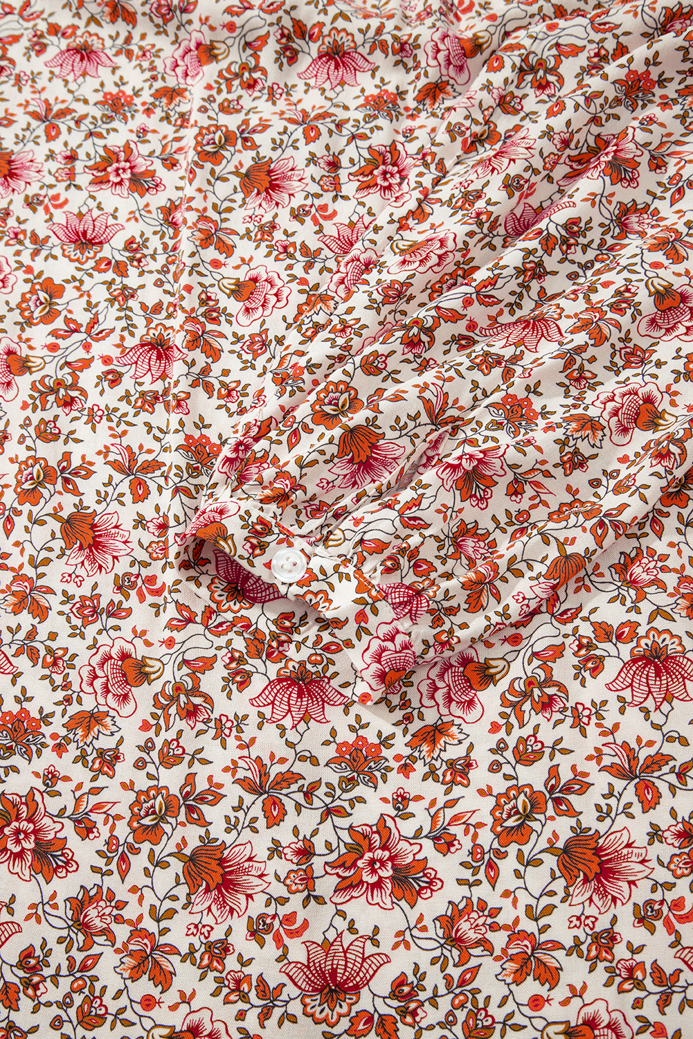 Red Floral Print Pleated Detail Notched Neck Puff Sleeve Blouse