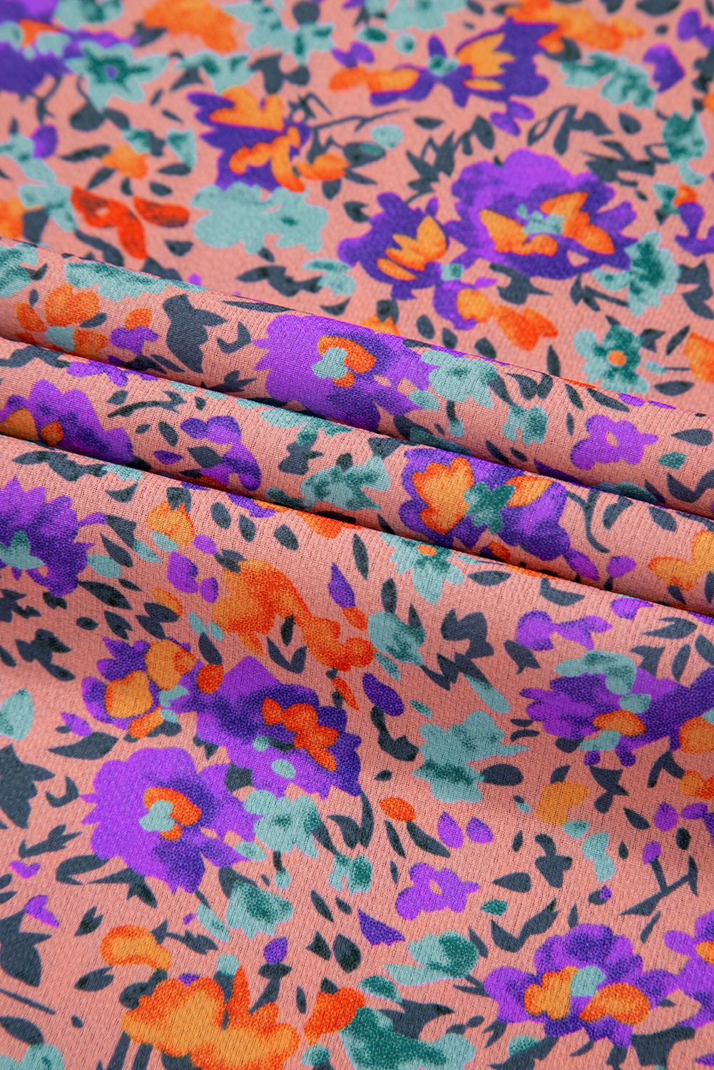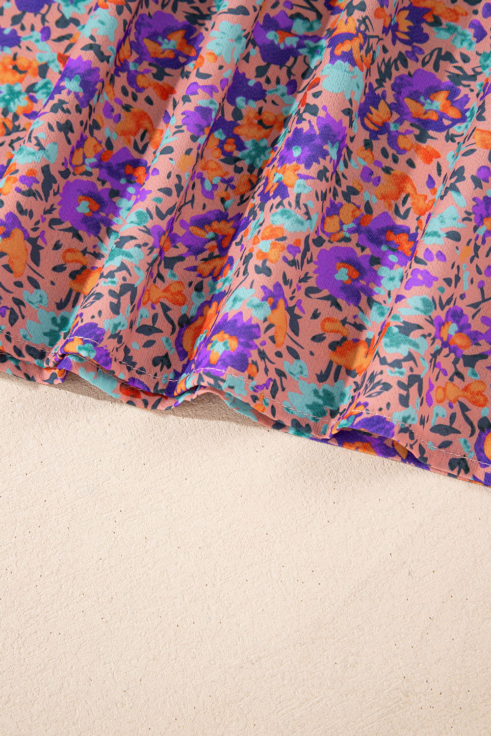 Purple Floral Allover Print Shirred Cuff Frilled O Neck Blouse