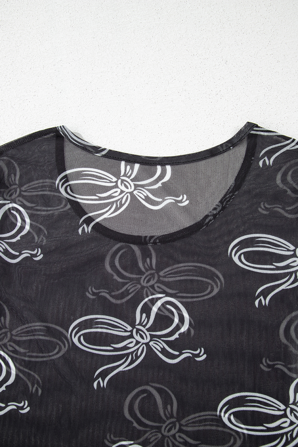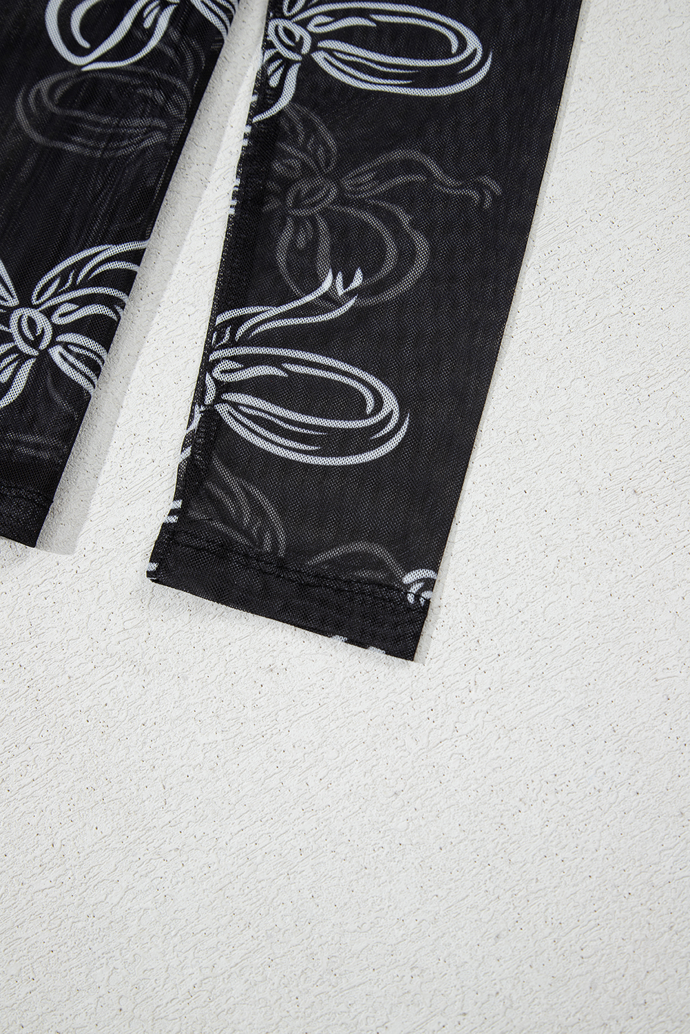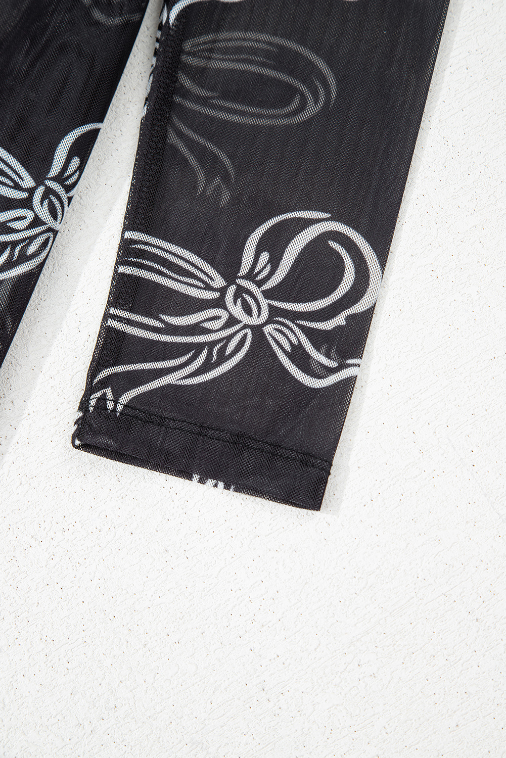 Black Round Neck Bow Print Long Sleeve Mesh Top