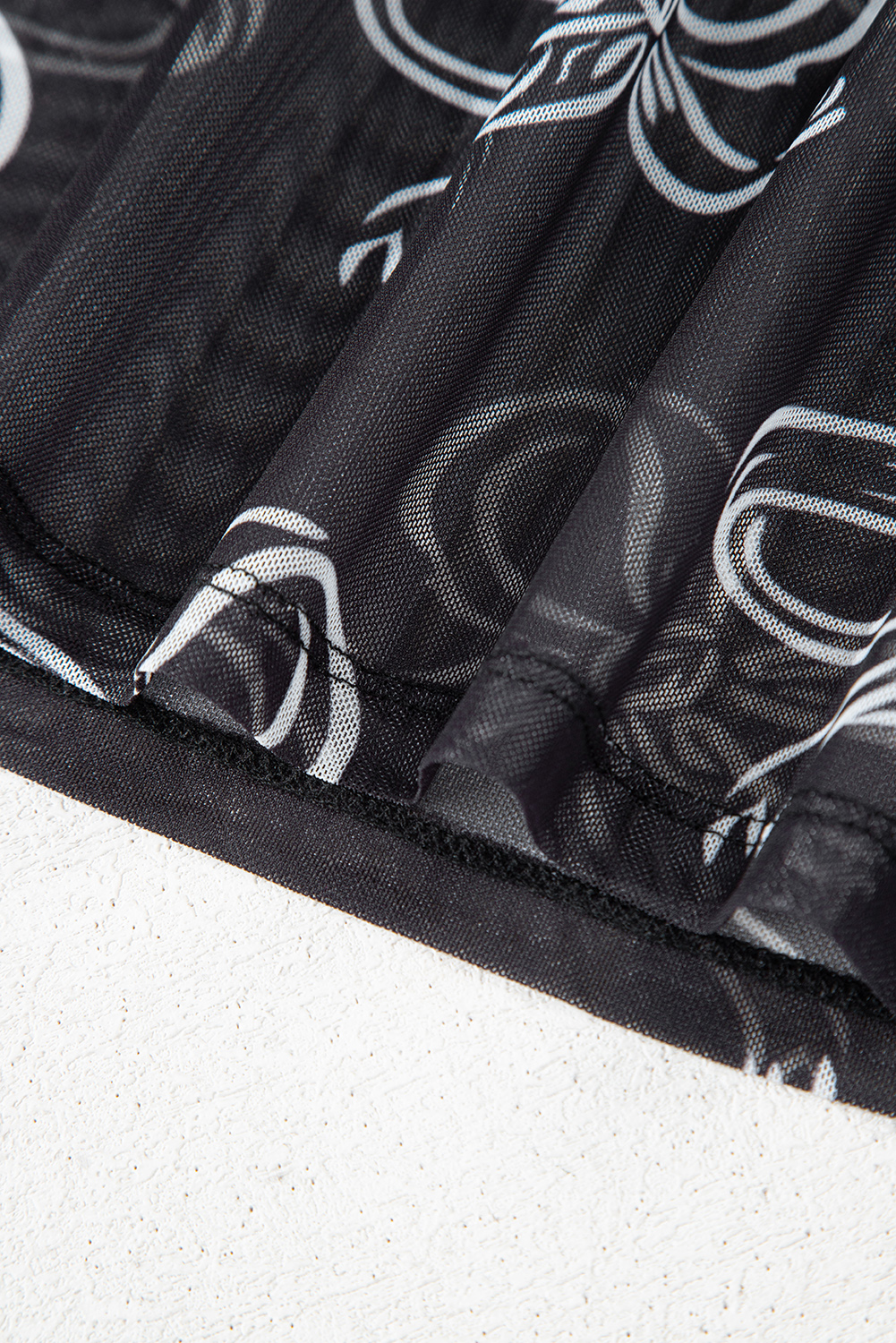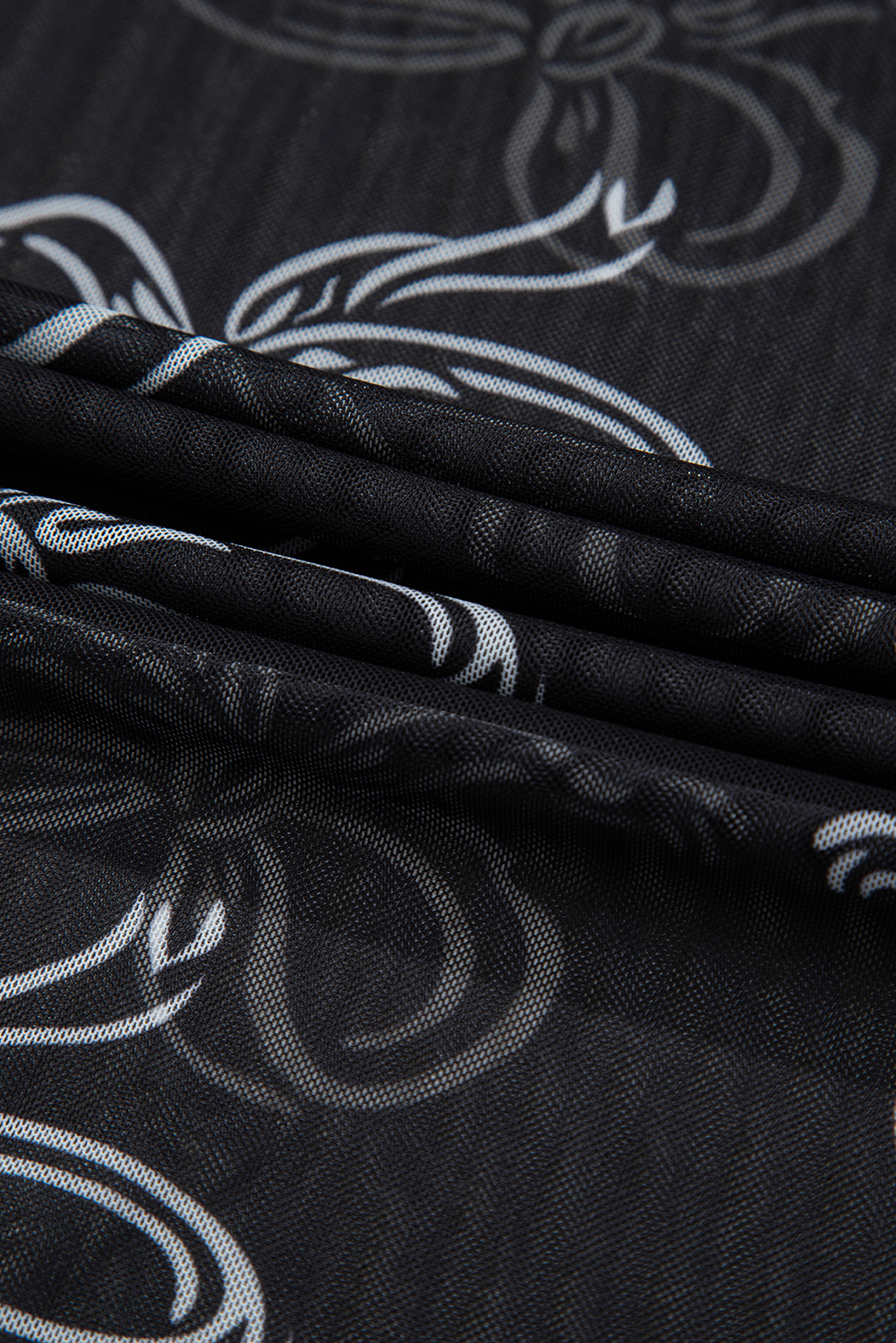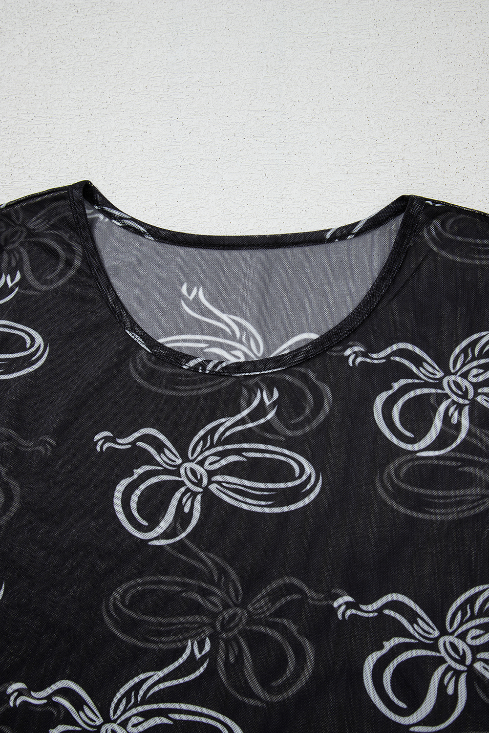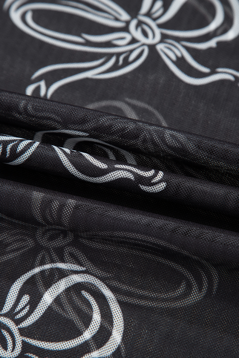 Black Round Neck Bow Print Long Sleeve Mesh Top