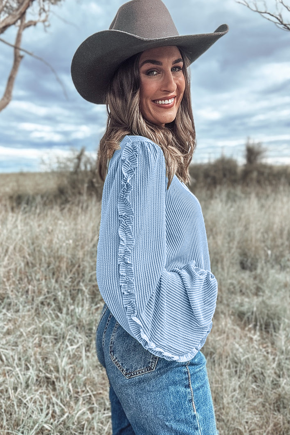 Mist Blue Corded Frilly Puff Sleeve Round Neck Blouse