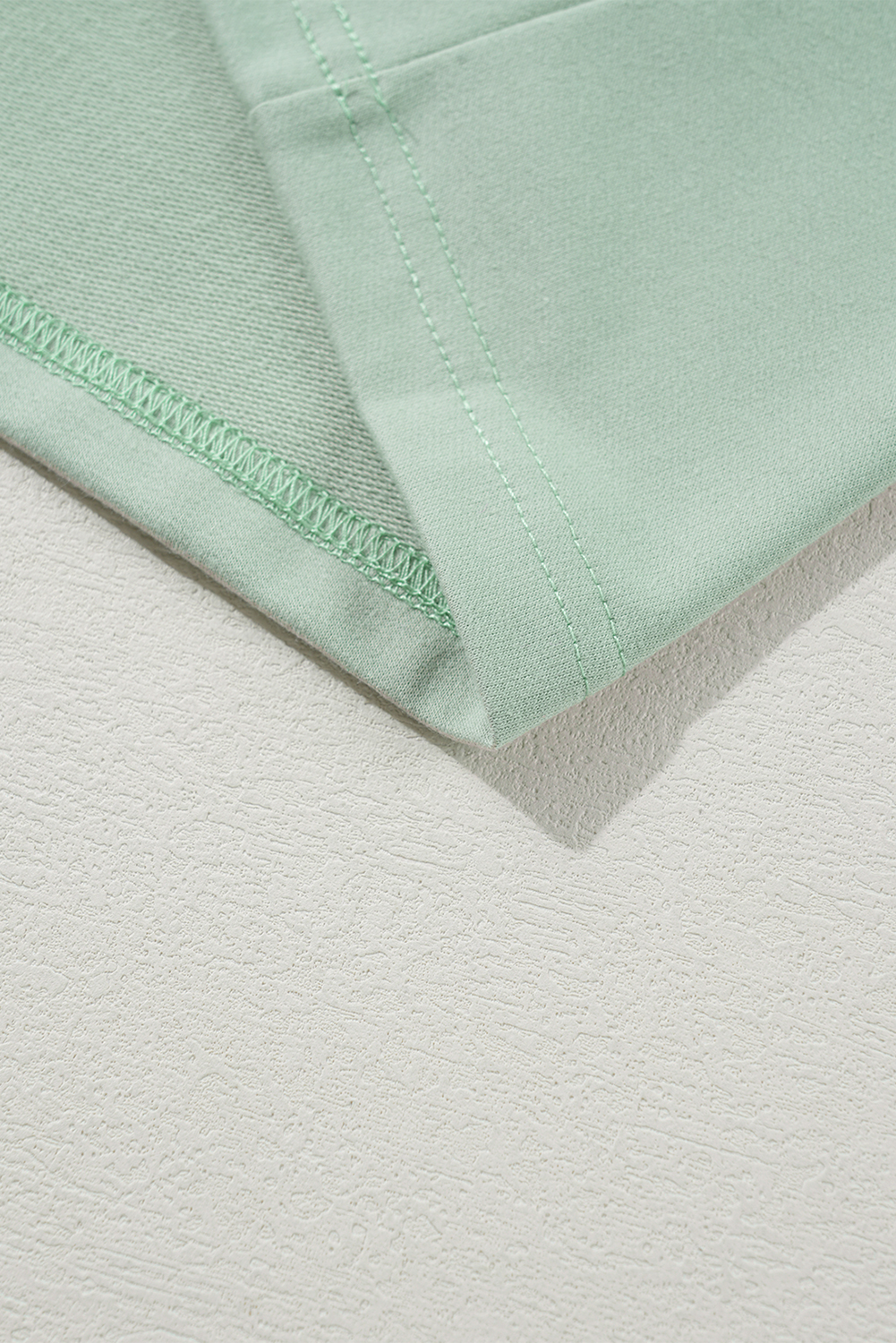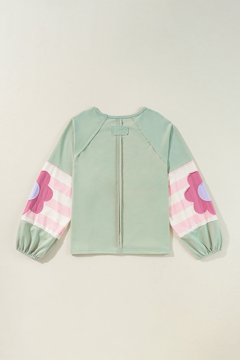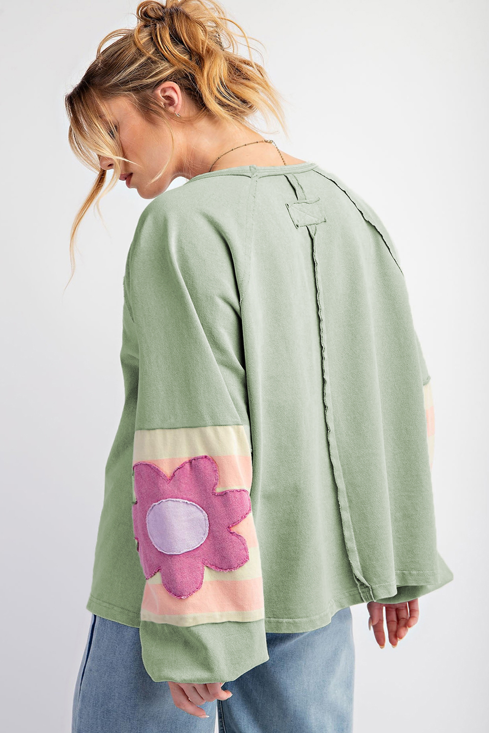 Smoke Green Flower Patchwork Raglan Sleeve Exposed Seam Oversized Top