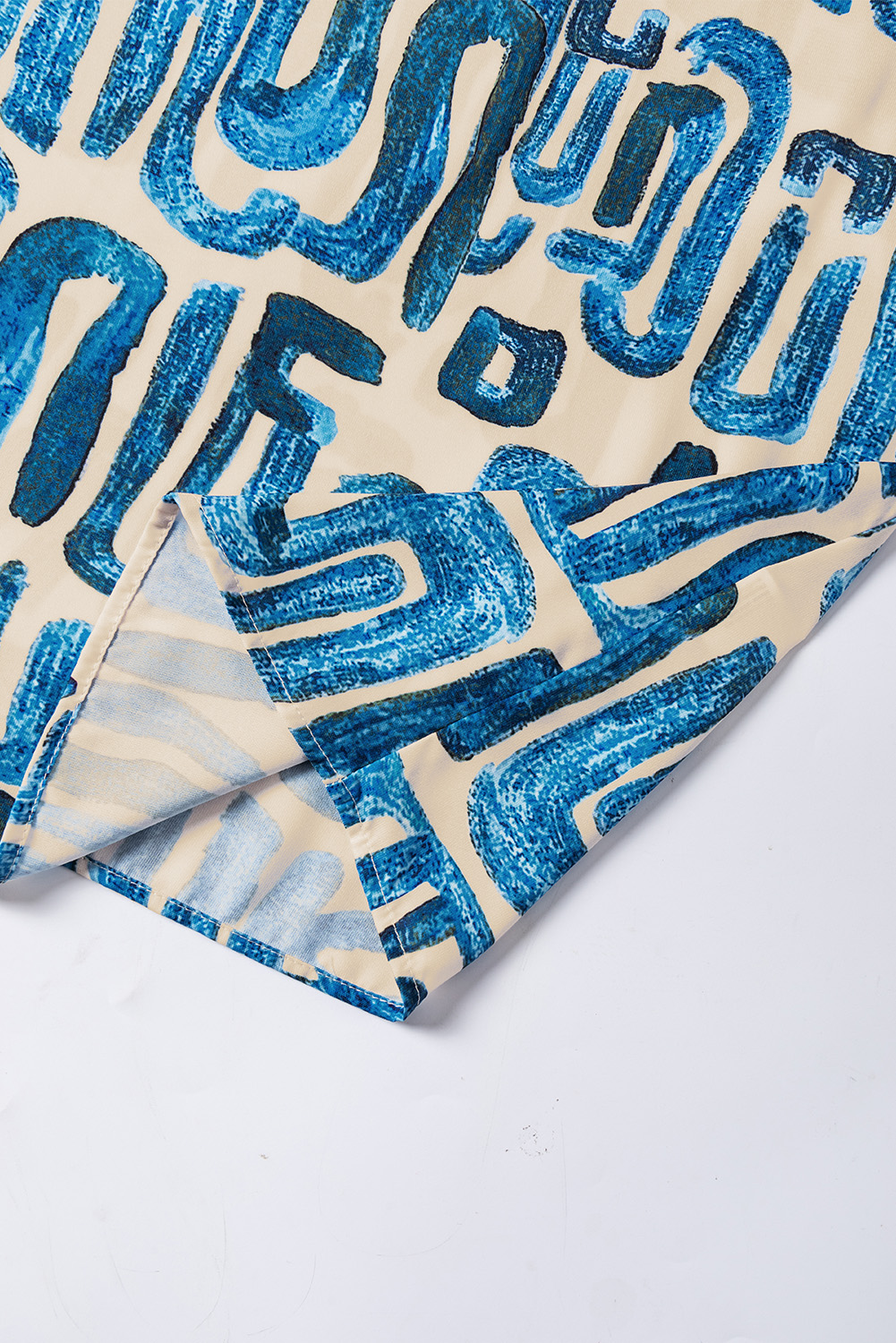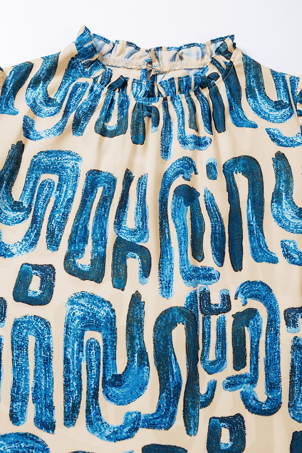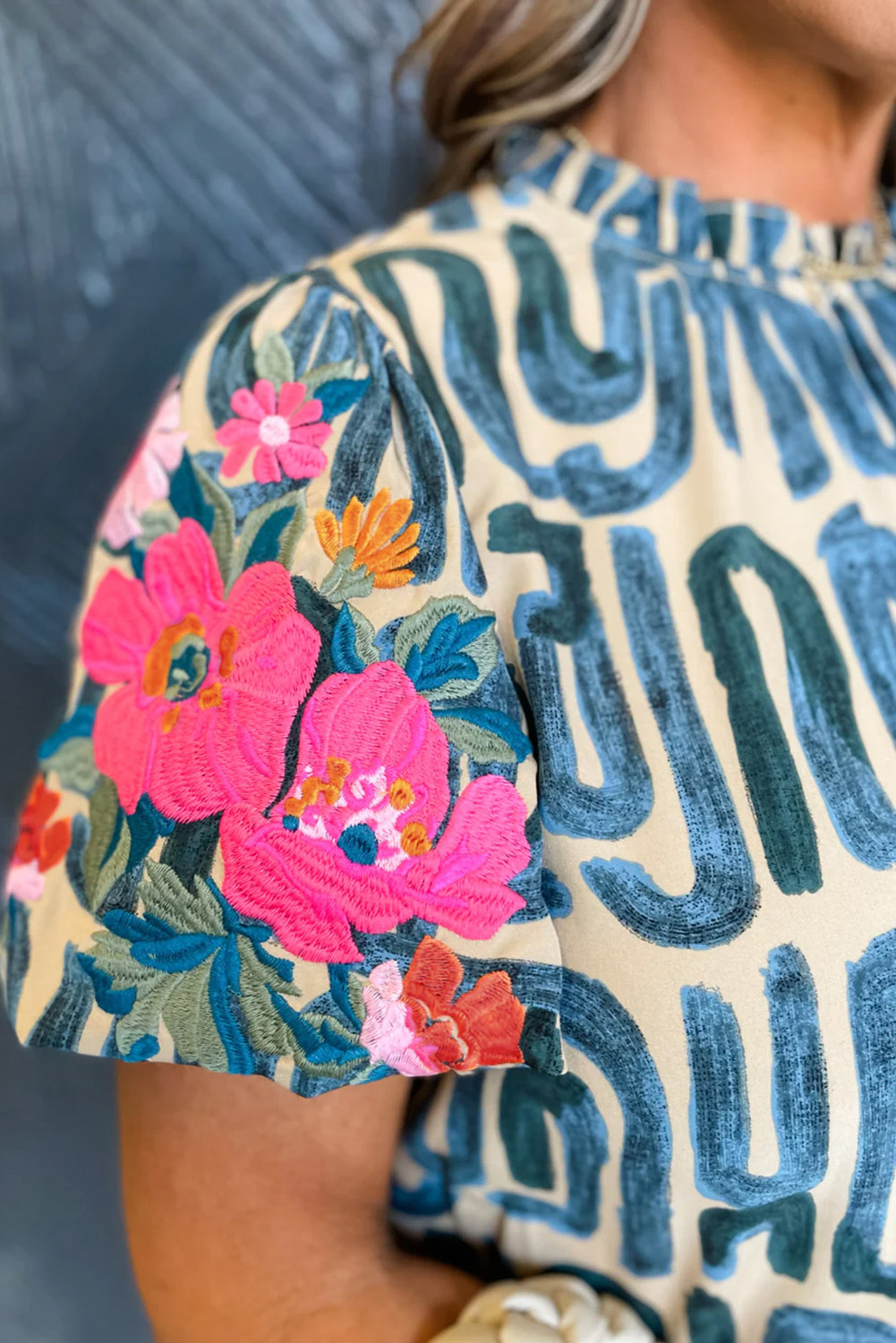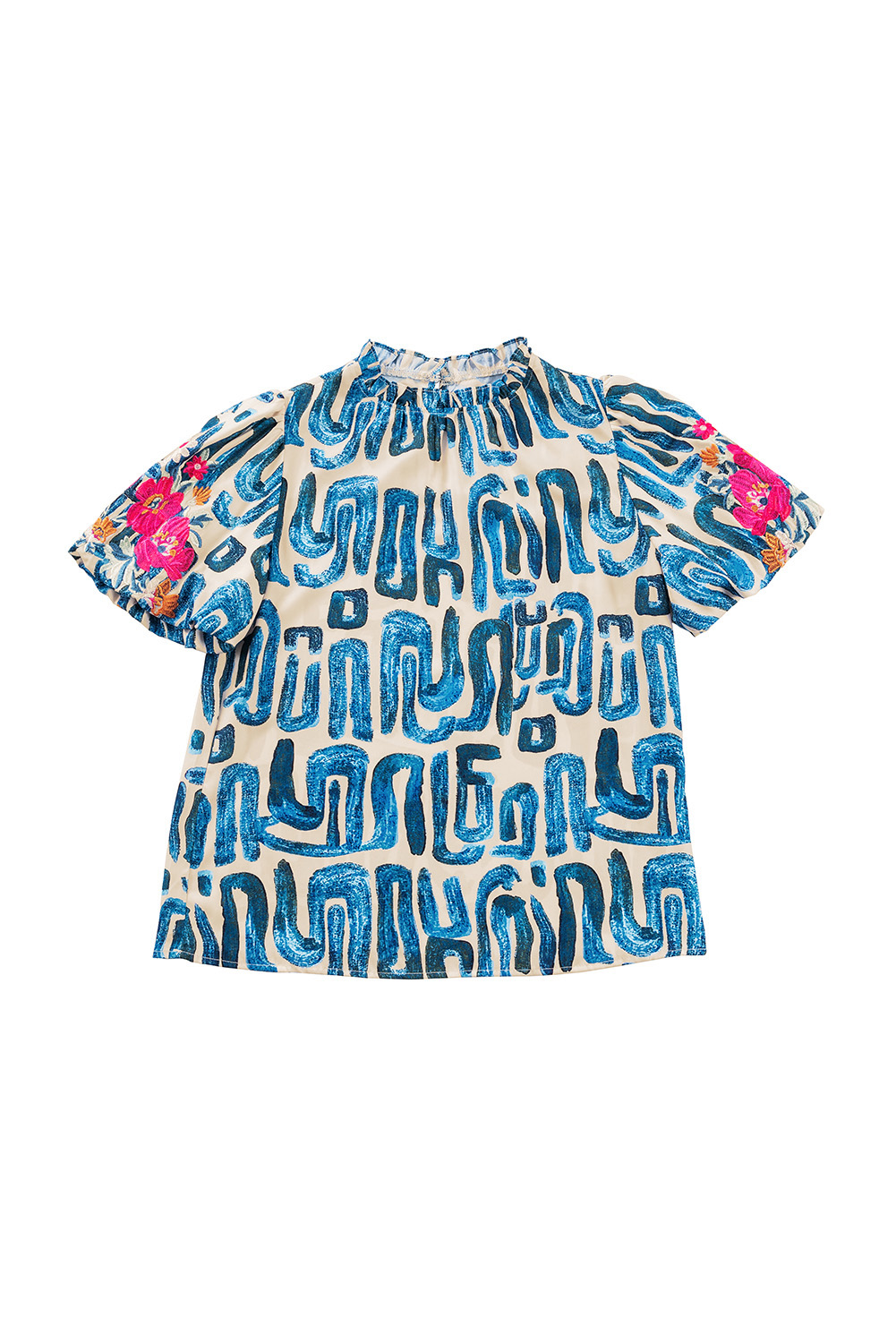 Beige Embroidered Puff Sleeve Frilled Neck Printed Top