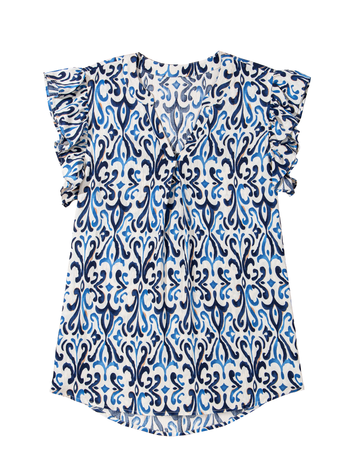 Sky Blue Boho Abstract Print Pintuck Detail Ruffled Top