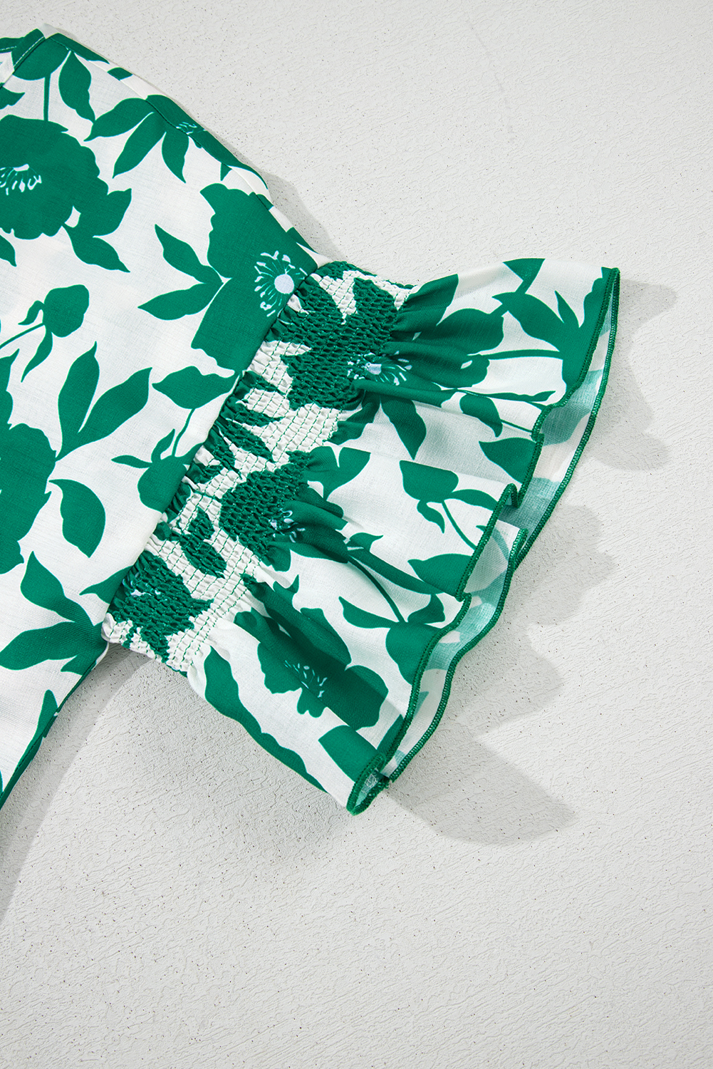 Green Floral Printed Ruffled Short Sleeve Round Neck Loose Blouse