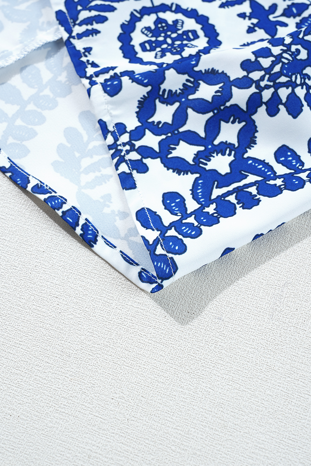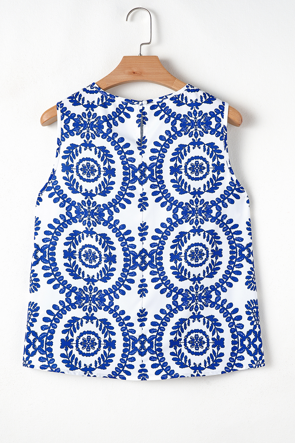 Blue Vintage Print Pintuck Crew Neck Tank Top