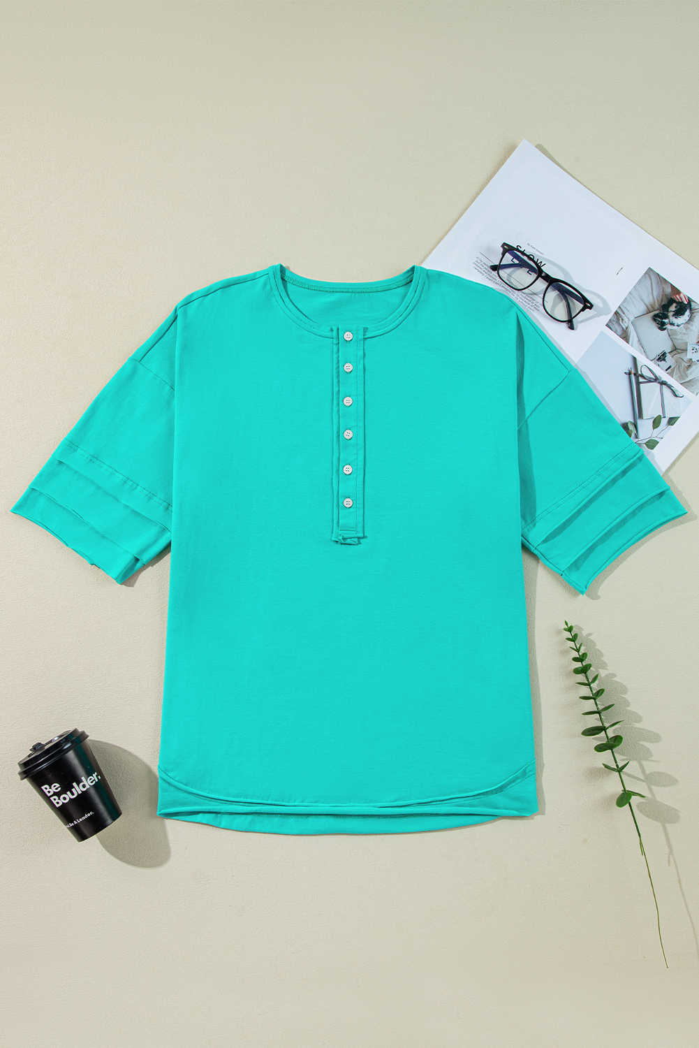 Mint Green Solid Color Half Sleeve Buttons Henley Top