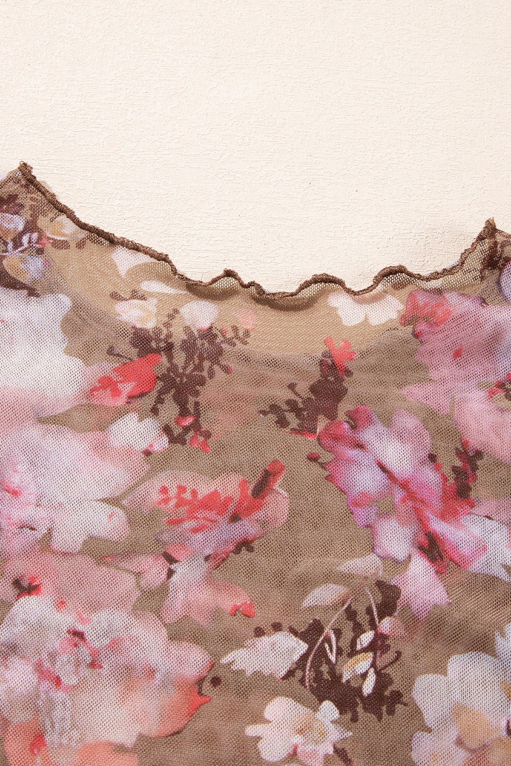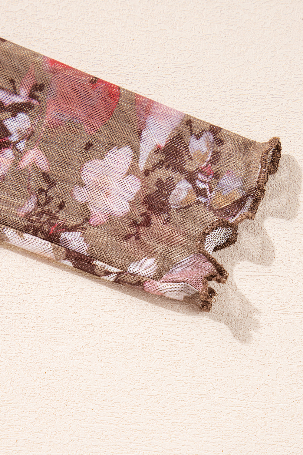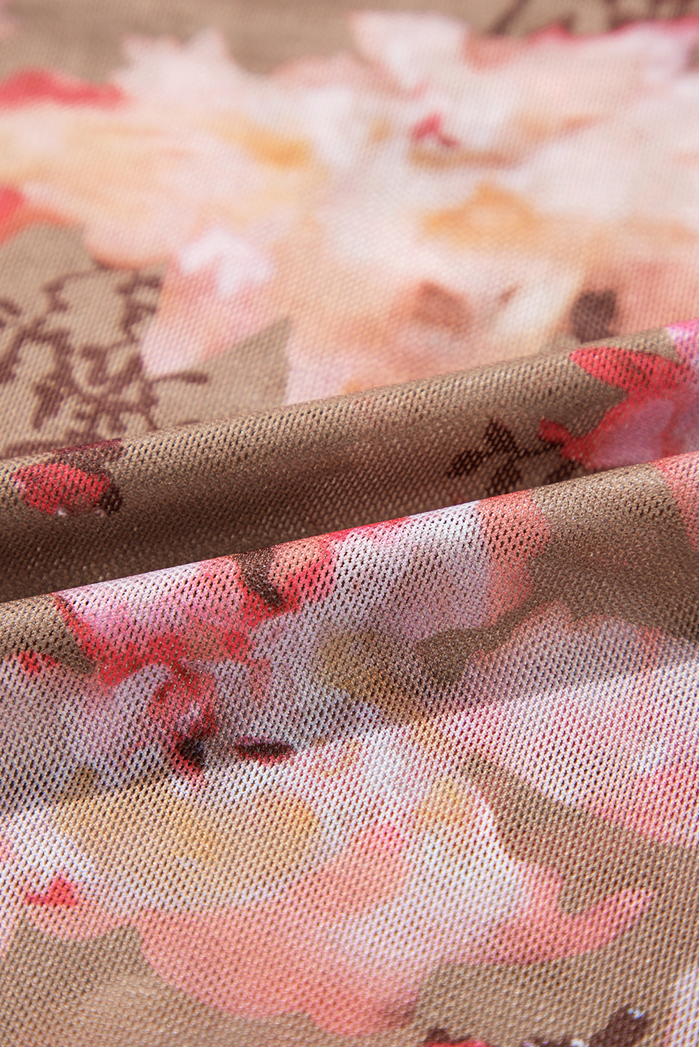Red Floral Print Sheer Mesh Long Sleeve Top