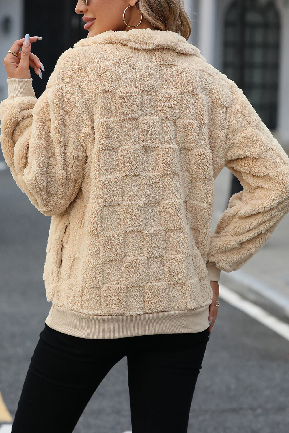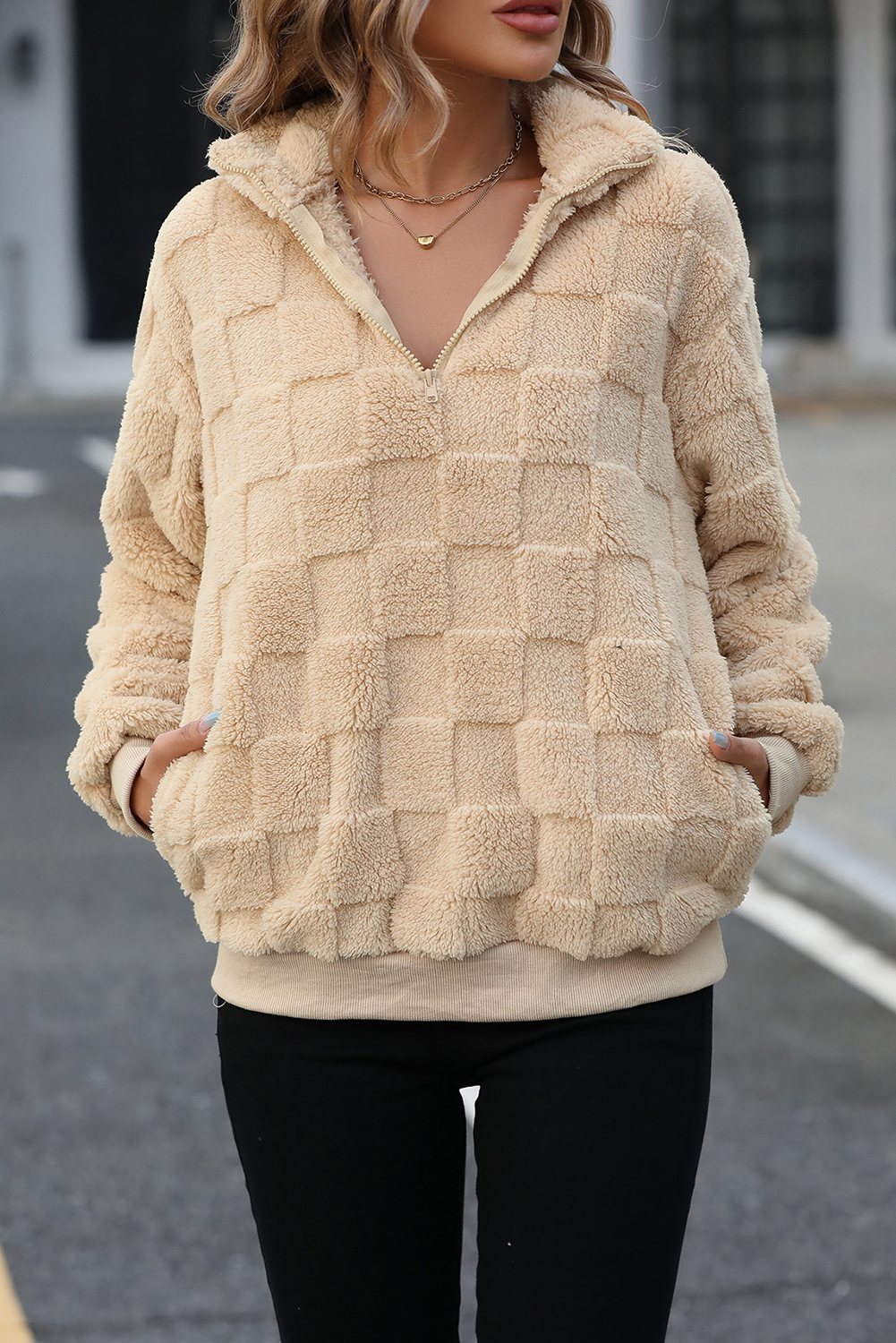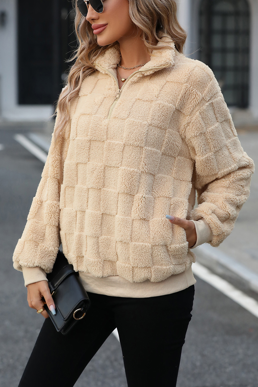 Apricot Checkered Plush Quarter Zipper Pullover Sweatshirt