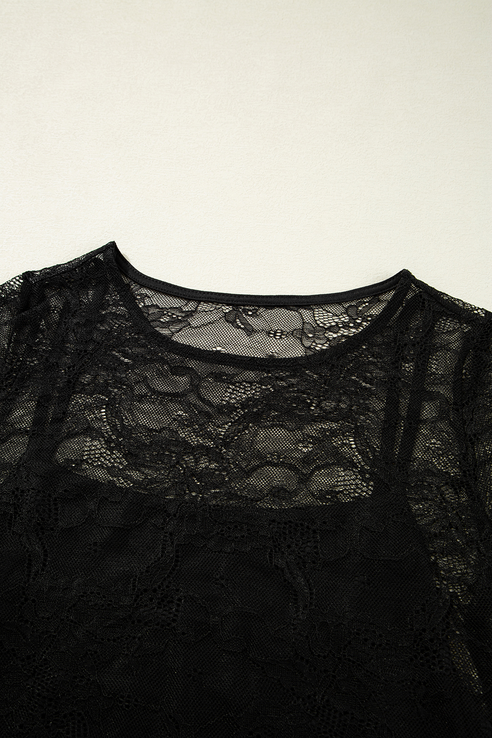 Black Lace Crochet Mesh Patched Slim Fit Long Sleeve Top