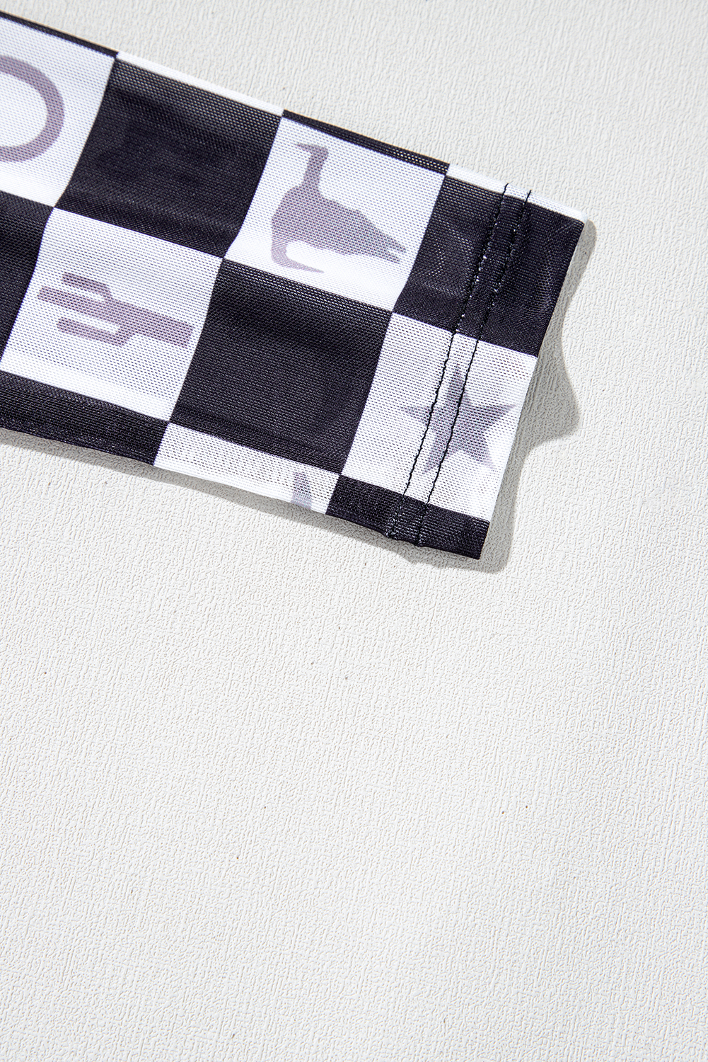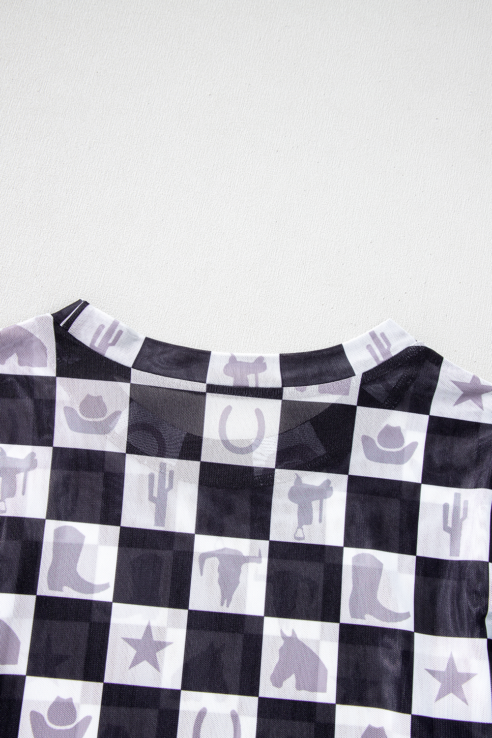 Black Checkerboard Western Elements Printed Mesh Long Sleeve Top