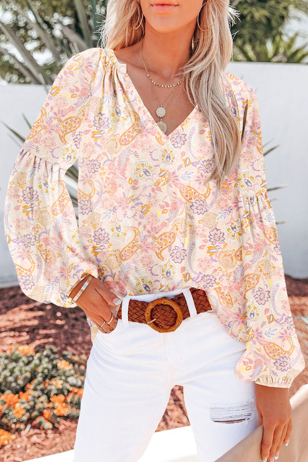 Golden Apricot Floral Print V Neck Long Puff Sleeve Top