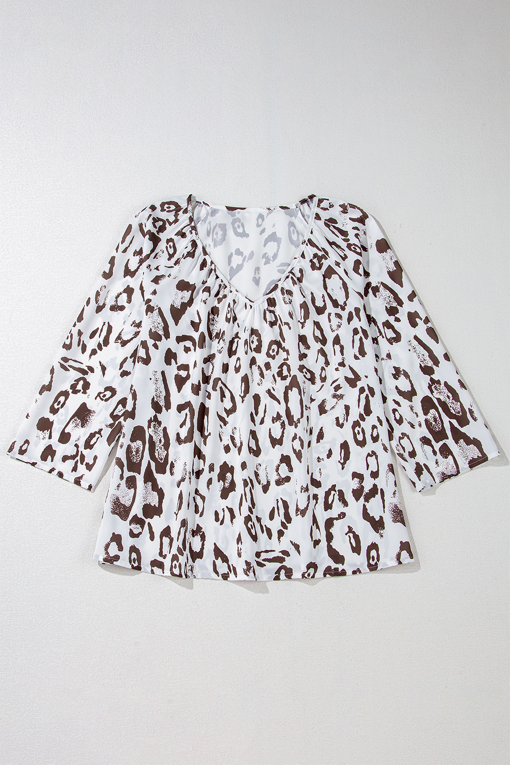 Khaki Leopard Print Ruched V Neck 3/4 Sleeve Blouse